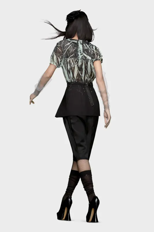 The layered cordura skirt is slashed to reveal the lining, creating a peplum silhouette. The work-in-progress stitches are present around the back zip and waist band with loose threads to indicate an unfinished aesthetic. Maison Margiela’s signature, the Four stitches, appear at the back; the opposite of a label.