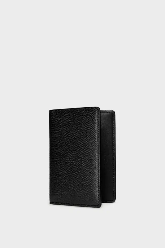 The cardholder has four card slots and sections for notes. It is crafted from grainy leather with the logo inside. Maison Margiela's signature, the four stitches, appear on the back; the opposite of a label.