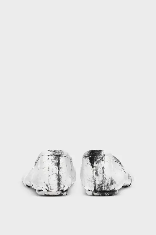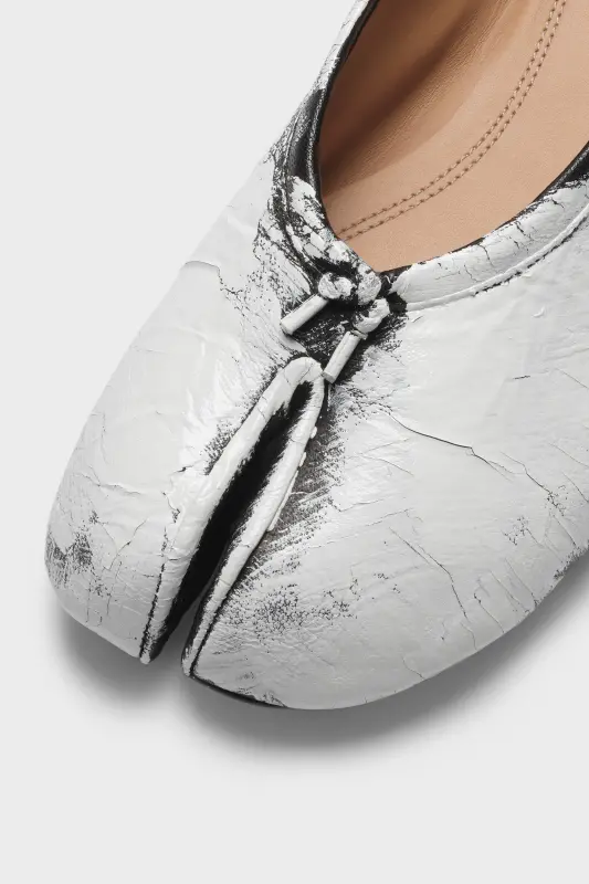 In nappa leather with hand-painted treatment, the Maison presents the Tabi new ballerinas, which take their design from ballerina shoes in the archives. They are crafted with handmade folds, manually worked to create an artisanal vintage effect at the sides. They feature the Tabi split-toe, inspired by the traditional 15th century Japanese sock bearing the same name – launched for the Maison's debut collection in 1989. It captures the avant-garde and insubordinate spirit of the Maison and exists as a heritage classic, continually explored through each collection.