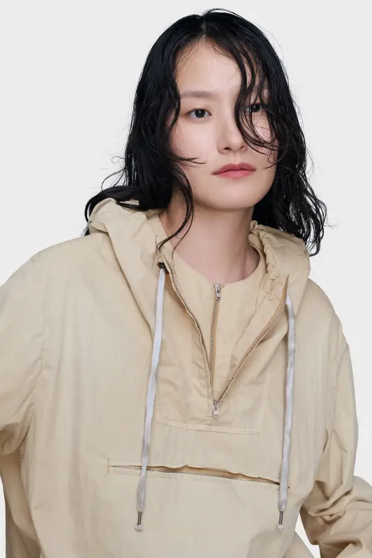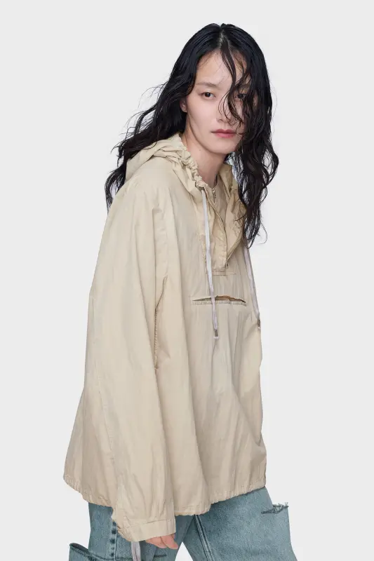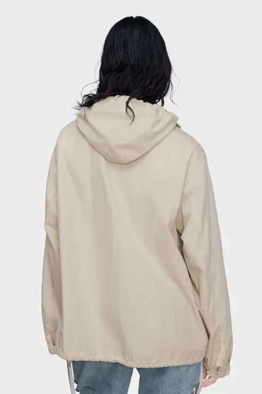 This caban in cotton reworks a functional classic through proportion and finish. It features a hood, half-zip fastening, and drawstring ties, with elasticated hems and cuffs that define the silhouette. At the back, the Maison’s signature four stitches appear; the opposite of a label.