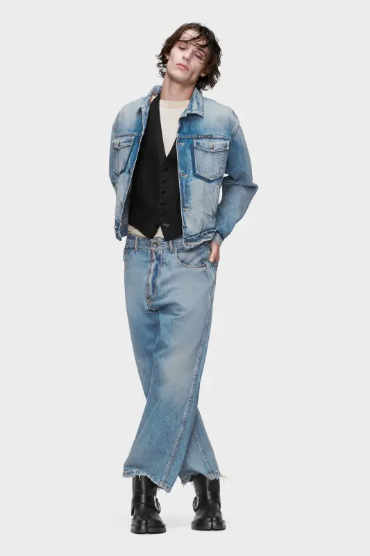 This caban is cut from washed denim and treated to evoke authentic wear. Creases, shading, and softened edges bring dimension, elevating a utilitarian silhouette through artisanal finish. Patch pockets and a button fastening complete the design. At the back, the Maison’s signature four stitches appear; the opposite of a label.