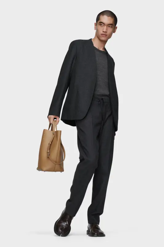 These trousers are tailored in virgin wool and finished with a drawstring waist. Sharp creases define the front, while welt pockets at the back keep the line precise. A subtle disruption of tailoring codes, where comfort becomes an intrinsic element of design. At the back, the Maison’s signature four stitches appear; the opposite of a label.