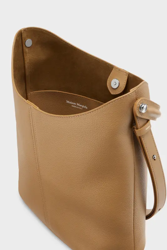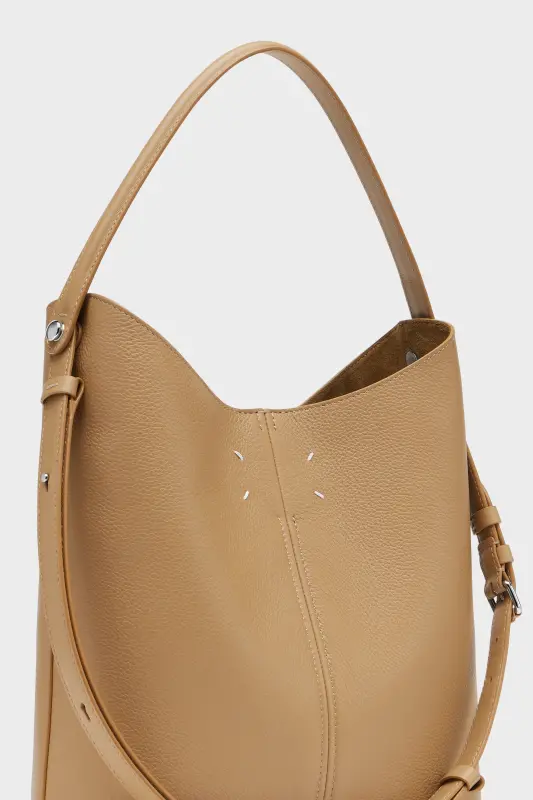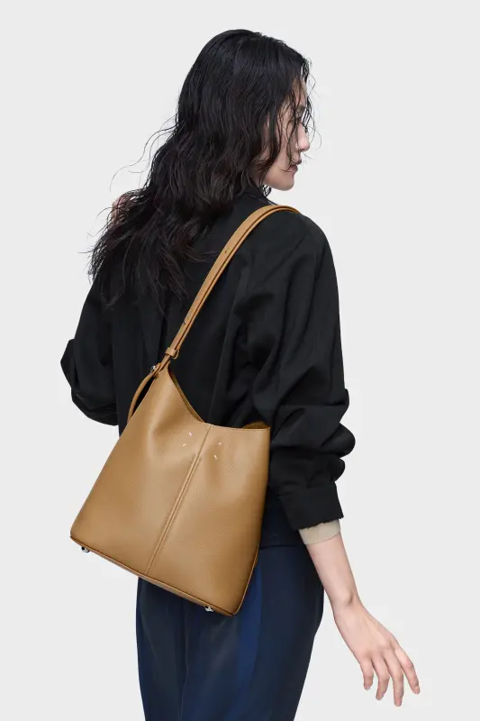 The Maison launches the Dress-age hobo for SS25, crafted from soft pebbled calfskin. With an equestrian spin, the small handbag features classic leatherwork and refined lines, combining unconscious glamour with gestural design. It follows a conical shape with contrast dual-wear strap detail. The studded base allows the bag to stand, and the inner is adorned with the logo. Maison Margiela's signature, the four stitches, appear at the back; the opposite of a label.