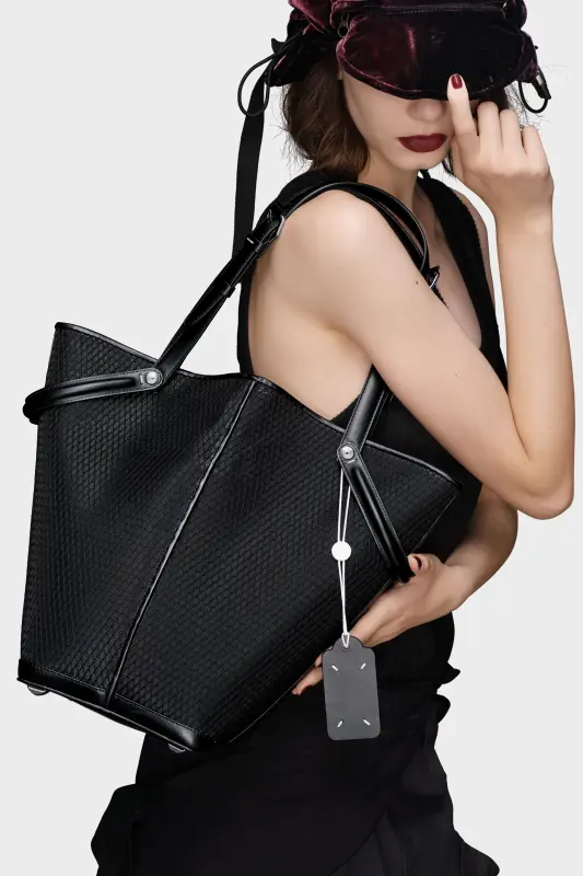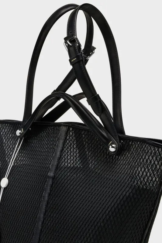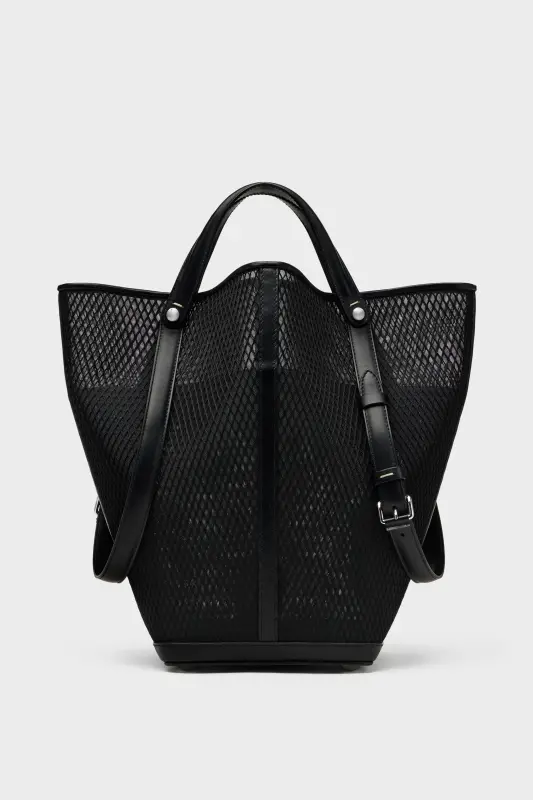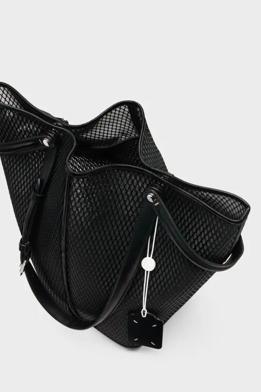 The Maison launches the Dress-age handbag for SS25, crafted from calf leather with a net overlay. With an equestrian spin, the medium handbag is inspired by the regalities of dressage horse riding. It follows a trapezoid design with short strap detail, which can be worn as top handles or pushed down to mimic stirrups with the longer, adjustable buckled straps worn over the shoulder. The base is studded, allowing the bag to stand, and the inner is accented with the logo. It features a logo identity tag with contrast string. Maison Margiela's signature, the four stitches, appear at the side; the opposite of a label.