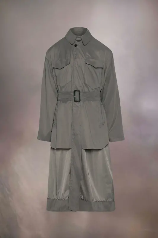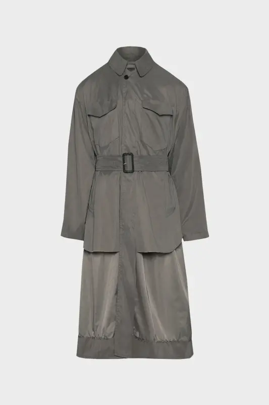 In a reversible style, the peached nylon blend trench coat is designed through the Maison's code of décortiqué, exposing the construction of the garment to create something strikingly new. With work-in-progress stitches with loose threads around the 'onion skin' panels, the layered coat is completed with a waist belt and chest pockets. Maison Margiela’s signature, the Four stitches, appear at the back; the opposite of a label.