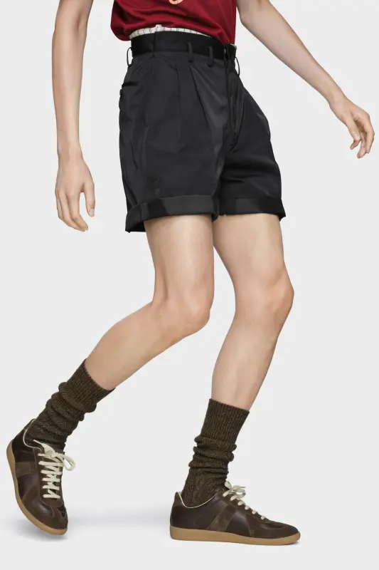 Tailored with clean pleats and raw hems, these shorts offer subtle versatility. A striped lining is partially exposed at the waistband – an intentional reveal that reflects the Maison’s play with Anonymity of the Lining. Maison Margiela’s signature, the four stitches, appear at the back; the opposite of a label.