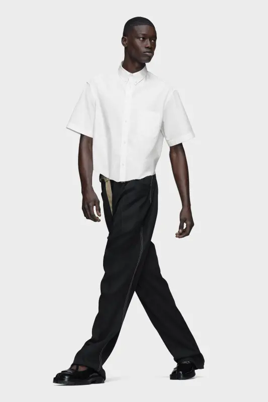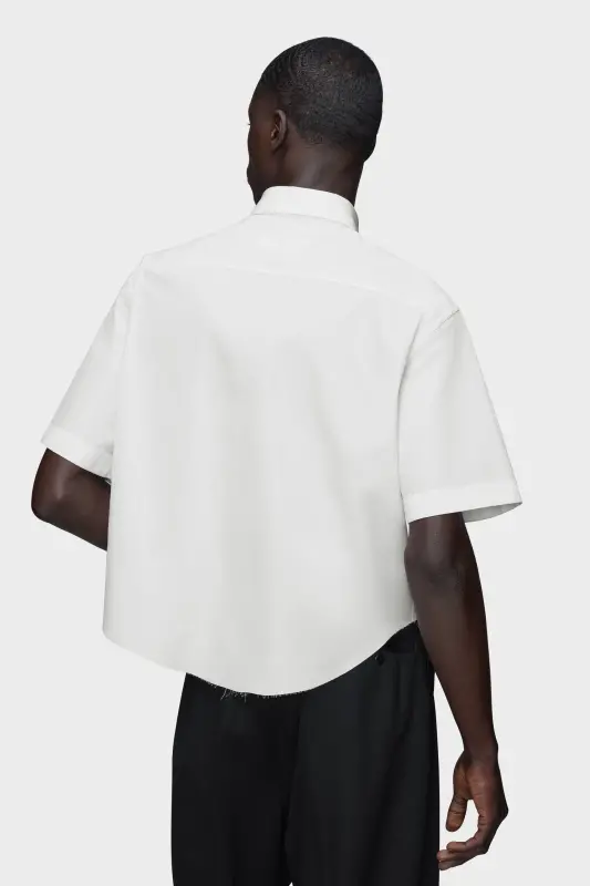 This cotton shirt is shaped for simplicity, with a cropped length, raw edge and a reverse Decortiqué chest pocket. The exposed finish interrupts the clean lines, revealing a glimpse of the garment’s construction. Maison Margiela’s signature, the four stitches, appear at the back; the opposite of a label.