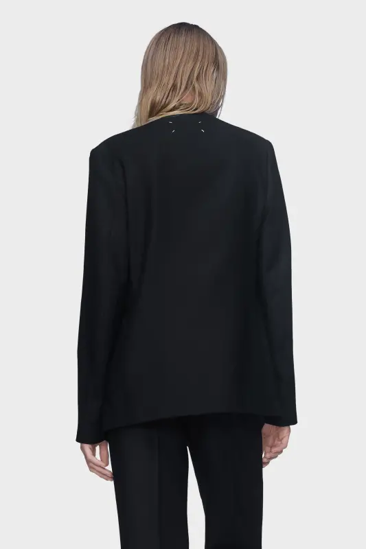 This minimal jacket is tailored in virgin wool with a clean, collarless silhouette. The open front creates a refined line, while its sharp cut lends quiet structure to the relaxed fit, distilling tailoring to its purest form. At the back, the Maison’s signature four stitches appear; the opposite of a label.