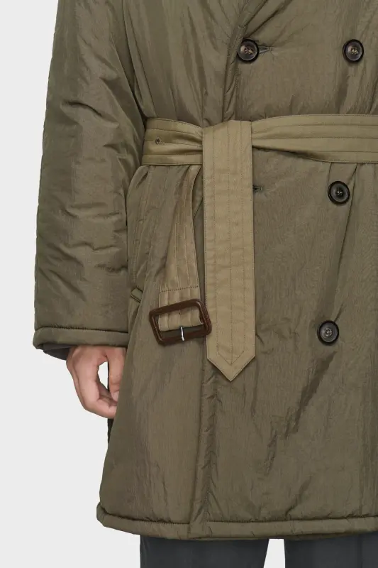 Maison Margiela reworks the caban in nylon, creating a coat defined by comfort and ease. Padded throughout, it gains a structured yet protective quality, while the belted waist, broad lapels and button closure retain its classic form. At the back, the Maison’s signature four stitches appear; the opposite of a label.