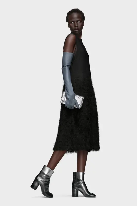 Crafted in silk knit, this sleeveless dress deconstructs surface texture through the Maison’s Retrograding technique – where density and detail degrade from hem to neckline. The fabric shifts from a plush, voluminous base into a light gauze at the top, evoking the fading of an unfinished sketch. Sheer throughout, the piece is underpinned by a tonal detachable slip dress lining. At the back, the four stitches appear; the opposite of a label.