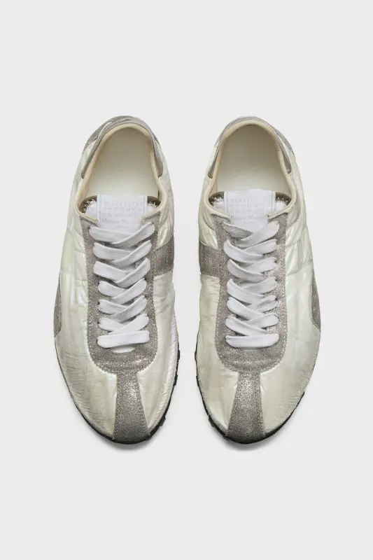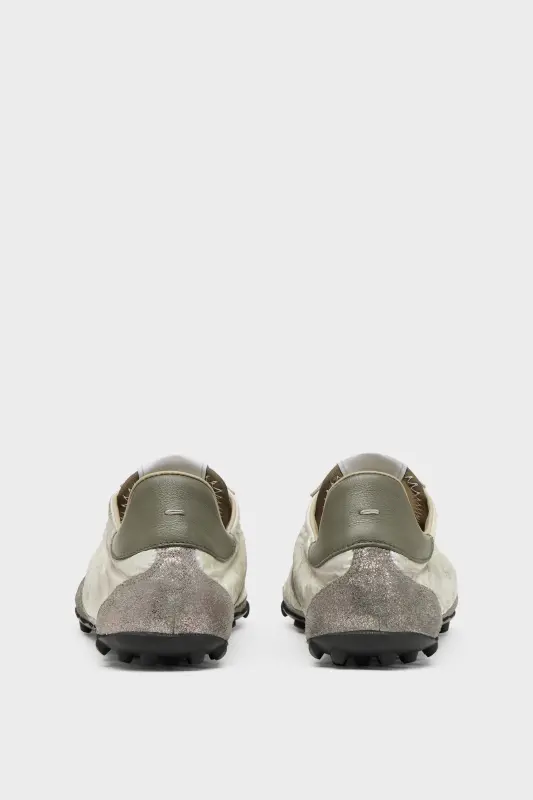 Maison Margiela revives 1960s spike shoes through high-shine lamé with glitter suede accents and tonal calfskin panels, treated for a distressed effect. The cleated sole includes numeric detailing, with 22 circled to indicate the footwear collection. The tongue bears the numeric logo, while Maison Margiela's signature single white stitch appears at the back.