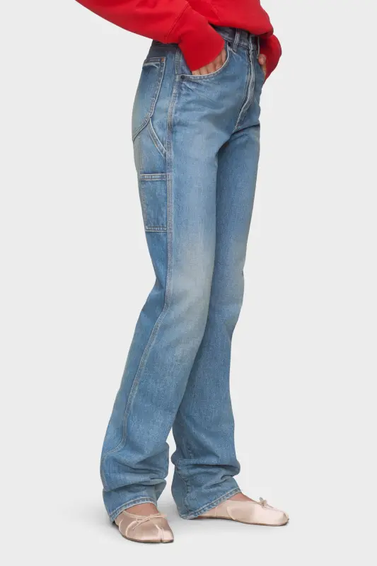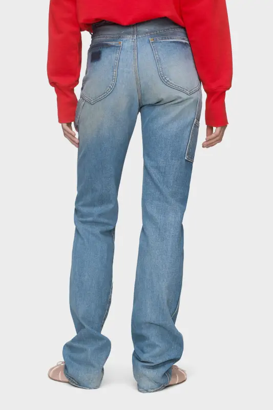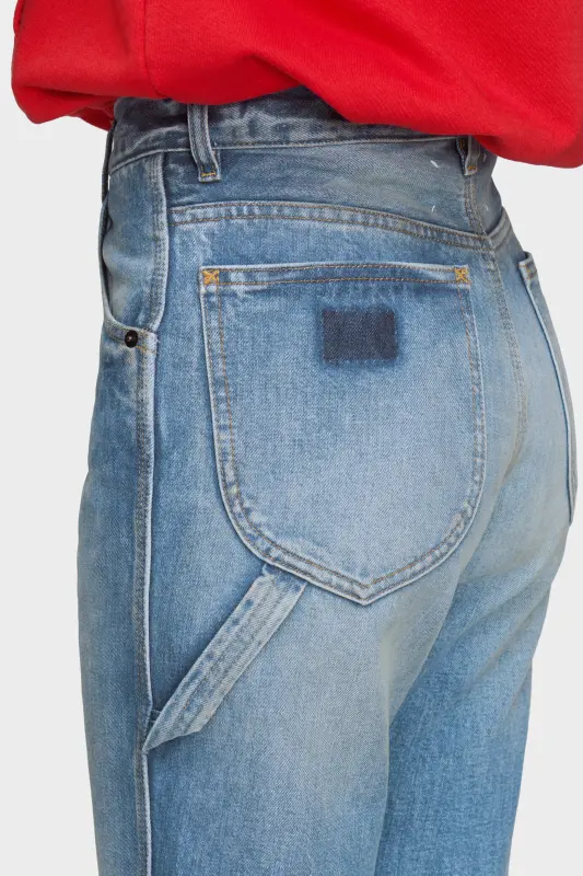Cut in cotton denim, these jeans feature a straight-leg silhouette with subtle fading across the seams. A side utility pocket disrupts the classic 5-pocket design, while the memory of the jacron patch reinforces the Maison’s deconstructive approach. At the back, the Maison’s signature four stitches appear; the opposite of a label.