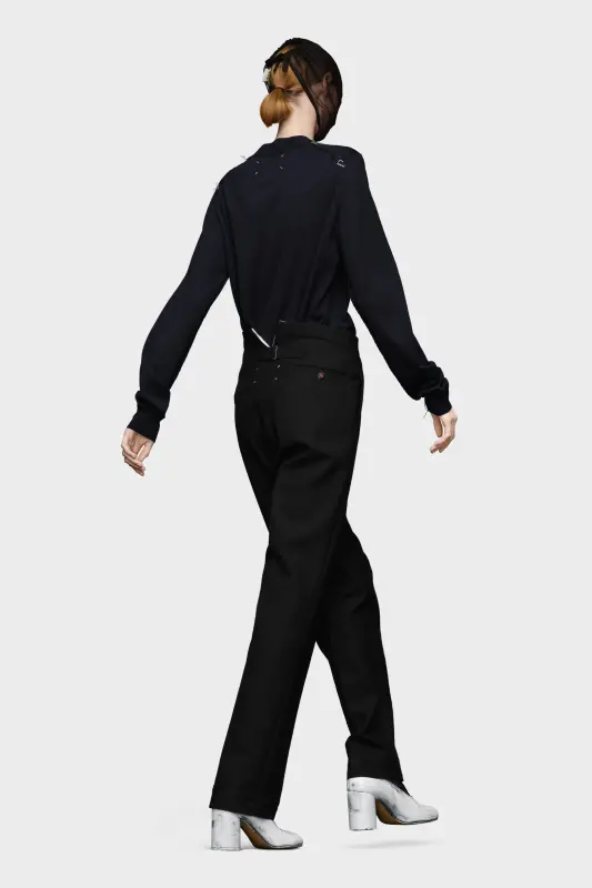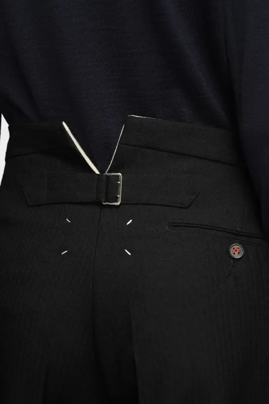In Herringbone wool, these pleated trousers present the Maison Margiela hook and eye. With turned-up cuffs, an adjustable back and the M button, they're finished with four white stitches to show the hand of the Maison: the opposite of a label.