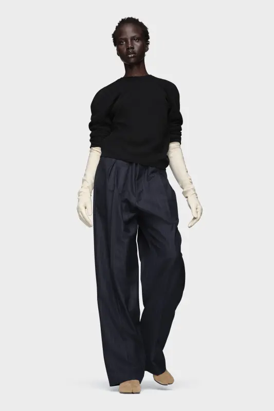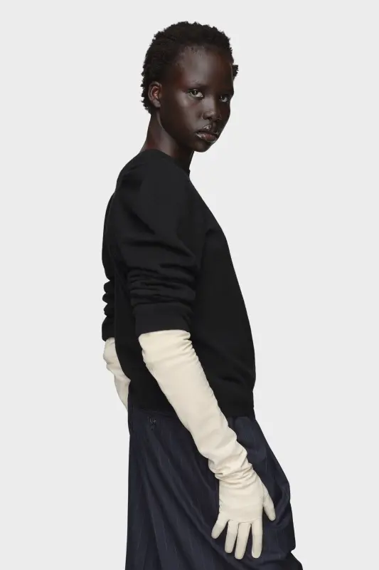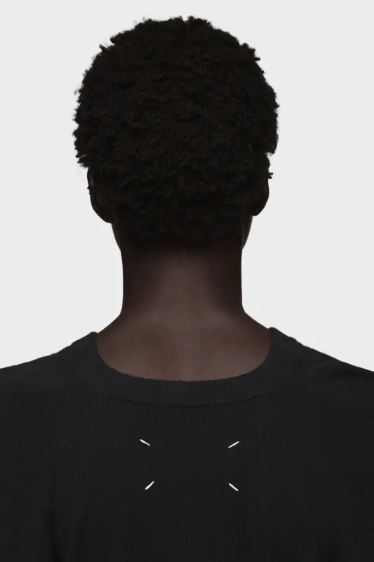 Maison Margiela transforms a familiar silhouette through its gestural cutting technique, capturing the unconscious act of getting dressed. The raised shoulder seams on this wool jumper trace that fleeting moment – refined, expressive, and unforced. At the back, the Maison’s signature four stitches appear; the opposite of a label.
